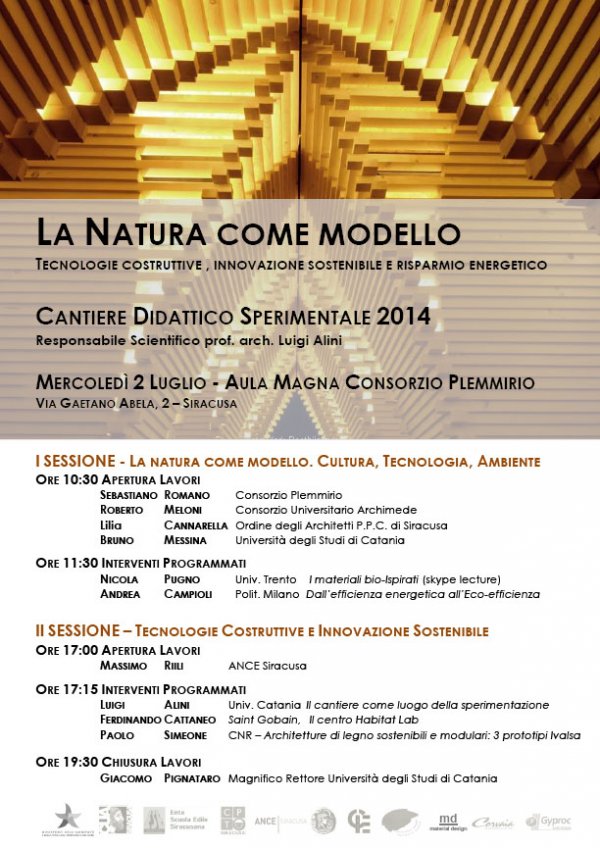 Mercoledì 2 luglio alle 10:30, nell'aula magna del Consorzio Plemmirio (via Gaetano Abela 2, Siracusa), si tiene il seminario conclusivo del cantiere didattico sperimentale "La natura come modello. Tecnologie costruttive, innovazione sostenibile e risparmio energetico", coordinato dal prof. Luigi Alini.