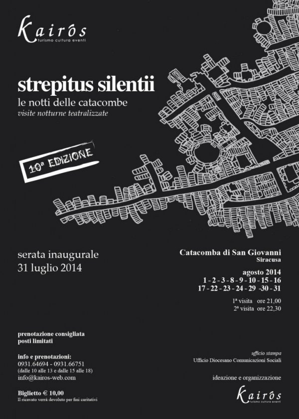 Lo strepitus silentii, il fragoroso silenzio della Catacomba di San Giovanni a Siracusa non è soltanto un percorso tra vestigia di una ricchezza immensa che nei sottosuoli della città aretusea respirano, ma è anche momento di meditazione sulle nostre radici religiose. L'iniziativa ideata da Kairós è un percorso che aiuta a comprendere quanto complessa, storicamente significativa e ricca di esperienze fu la realtà di Siracusa e della sua comunità cristiana in epoca romana. La scelta di non raccontare la storia del sito archeologico, ma di teatralizzarla con delle voci narranti accompagnate dal suono di un flauto consente a chi vorrà intraprendere questo "viaggio" notturno nella catacomba di San Giovanni di vivere un momento di intensa spiritualità.
