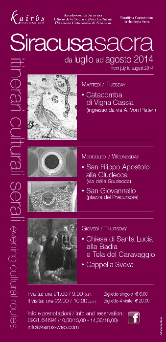 Fino a giovedì 28 agosto, a Siracusa, la Kairòsò turismo cultura eventi, la Pontificia Commissione di Archeologia Sacra - Ispettorato per le Catacombe per la Sicilia Orientale e l'Arcidiocesi di Siracusa - Ufficio Arte Sacra e Beni Culturali, organizzano la IV edizione di Siracusa Sacra, itinerari culturali serali alla scoperta dei beni culturali ecclesiastici archeologici, architettonici e artistici di Siracusa.
