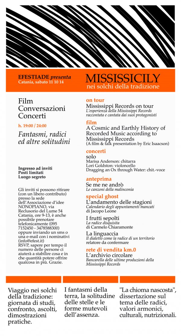 Sabato 11 settembre, a Catania (luogo segreto), Efestiade presenta Mississipi Records on tour, "Nei solchi della tradizione".