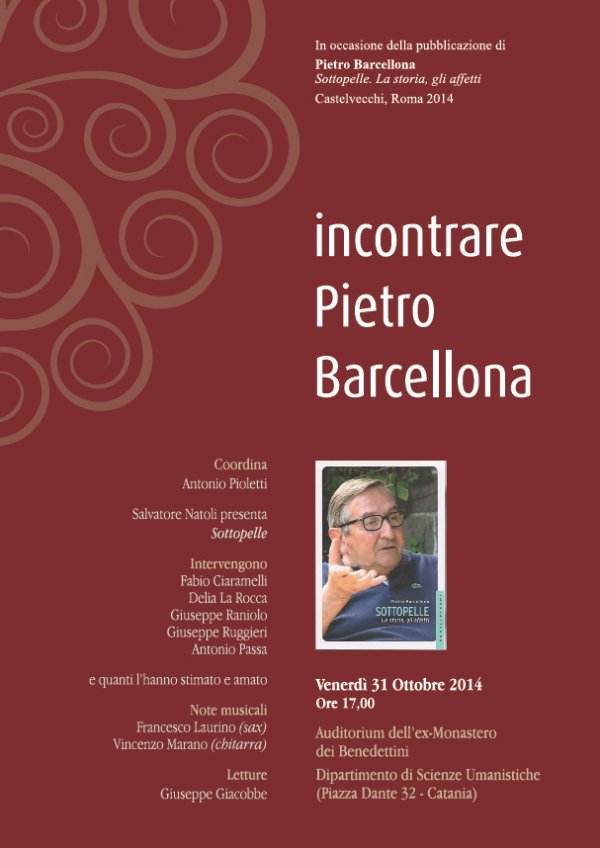 La pubblicazione postuma della sua autobiografia Sottopelle. La storia, gli affetti (Castelvecchi, 2014) è l’occasione per un incontro, a poco più di un anno dalla sua scomparsa (6 settembre 2013), dedicato non a un semplice ricordo di Pietro Barcellona, ma alla finalità di far rivivere quel che di contributi scientifici, intuizioni culturali, messaggi artistici, relazioni umane, egli ha lasciato come segno indelebile non solo nel mondo degli studi ma nella vita di chi ha avuto modo di formarsi al suo magistero o semplicemente di frequentarlo: un’ansia permanente di cercare il senso della vita, di comprendere il mondo, di mettersi in discussione, di dubitare, di dialogare.