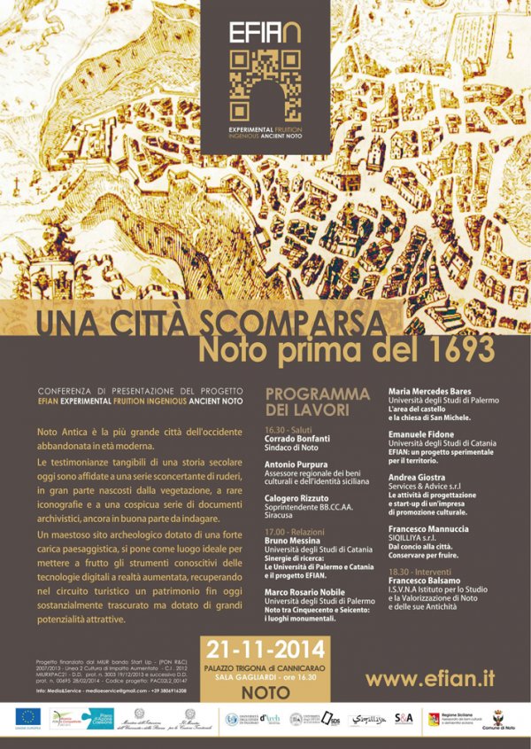 Venerdì 21 novembre alle 16:30, nella Sala Gagliardi di Palazzo Trigona di Cannicarao a Noto, nel corso della giornata dal titolo Una città scomparsa: Noto prima del 1693, sarà presentato il progetto "Efian" (Experimental Fruition Ingenious Ancient Noto), finanziato dal Ministero dell’Università e della Ricerca all’interno del Pon Ricerca e Competitività 2007-2013.