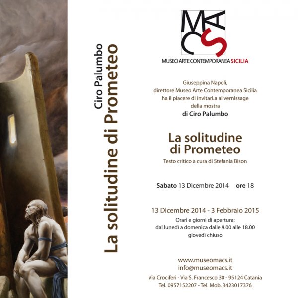 Sabato 13 dicembre alle 18, al MacS (Museo Arte Contemporanea Sicilia) nella Badia piccola del Monastero di San Benedetto a Catania, si terrà, il vernissage della mostra La solitudine di Prometeo di Ciro Palumbo. La mostra sarà visitabile fino al prossimo 8 febbraio 2015.
