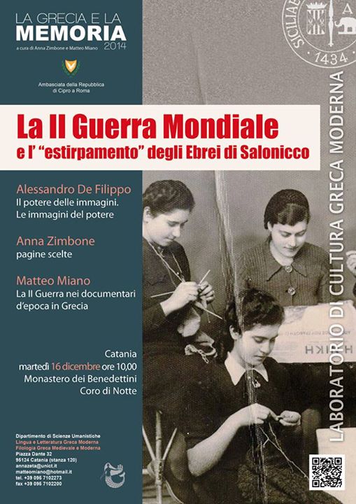 Martedì 16 dicembre alle 10, nel Coro di notte del Monastero dei Benedettini, si svolge il quinto incontro del laboratorio interdisciplinare di civiltà greca moderna 2014/15 "La Grecia e la Memoria", organizzato da Anna Zimbone (ordinario di Lingua e Letteratura Greca moderna, dipartimento di Scienze Umanistiche) e da Matteo Miano (assegnista di ricerca): La Seconda Guerra Mondiale e l’estirpamento degli Ebrei di Salonicco.