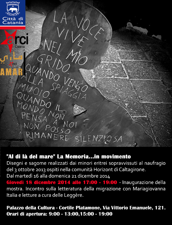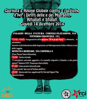 L'Arci Catania organizza anche quest'anno una serie di iniziative in occasione di tale giornata, con l'apertura della mostra "Al di là del mare". La mostra è composta da disegni realizzati dai profughi eritrei sopravvissuti al tragico naufragio del 3 ottobre 2013 e da sagome in legno che rappresentano e ricordano il difficile viaggio nel deserto del Niger/Libia.Le opere sono state create all’interno di un workshop al quale hanno partecipato i minori stranieri non accompagnati ospiti nella comunità Horizont di Caltagirone.