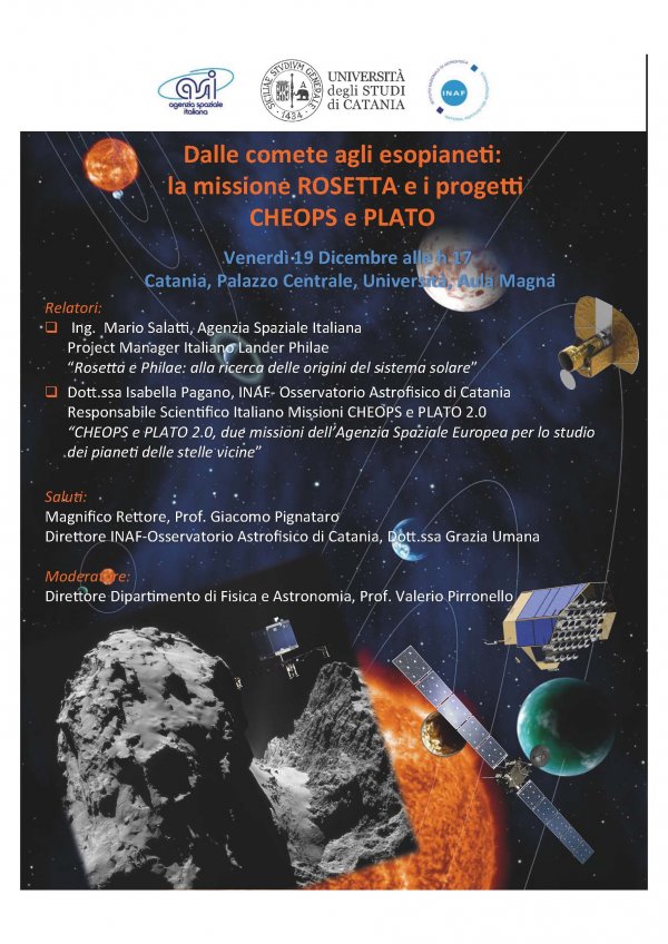 Venerdì 19 dicembre alle 17, nell’aula magna del Palazzo Centrale, si svolge la conferenza Dalle comete agli esopianeti: la missione Rosetta e i progetti Cheops e Plato, alla quale partecipano in qualità di relatori l'ing. Mario Salatti, project manager italiano del lander "Philae" (Agenzia Spaziale Italiana) e la dott.ssa Isabella Pagano, responsabile scientifico italiano delle missioni Cheops e Plato 2.0 (Inaf-Osservatorio Astrofisico di Catania).