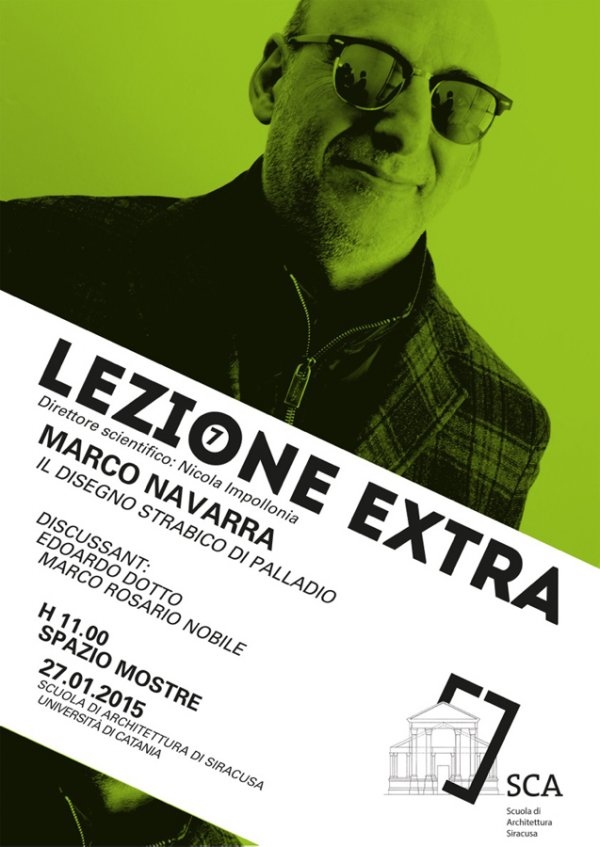La conferenza, dal titolo Il disegno strabico di Palladio, sarà tenuta da Marco Navarra, professore di Progettazione architettonica e urbana alla Scuola di Architettura di Siracusa. Fondatore dello studio Nowa, è autore di Robert Adam, Ruins of the Palace of the Emperor Diocletian at Spalatro in Dalmatia, 1754 (2002), Repairingcities. La riparazione come strategia di sopravvivenza (2008), Lo-fi: Architecture as curatorial practice, con Mario Lupano e Luca Emanueli (2010), Abiura dal paesaggio. Architettura come trasposizione (2012), DISPLAY. Didattica per un’architettura di relazione (2012), Linea d’ombra. 1978-1984: Adolfo Natalini tra il Superstudio e l’Architettura (2013).