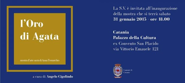 La mostra L'oro di Agata presenta la preghiera visiva dell'artista Anna Tomarchio attraverso dodici opere volte ad omaggiare la figura della Santa Patrona di Catania. Questa singolare creazione artistica scaturisce da una esperienza religiosa forte e sincera, da un paziente lavoro manuale, da un estro originale e puro. L'arte, attraverso la creatività e la sensibilità dell'artista, si fa preghiera, e si libra per unirsi ad Agata, alla sua purezza, alla sua tenace testimonianza di fede. Una giovane artista siciliana condivide i sentimenti, il sacrificio, il messaggio cristiano di una giovane donna catanese che sopportò il martirio per non rinunciare alla fede