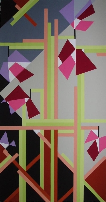 La passione per la pittura ed il profondo interesse per l’architettura, le cui forme di rappresentazione, quali la linea, si traducono in qualche modo nelle sue opere; opere geometriche, ordinate, organizzate, “asettiche”. Pensa e rappresenta la realtà che la circonda secondo un suo metodo, una specie di processo mentale che la porta automaticamente a semplificare ogni elemento, oggetto o pensiero riducendolo a pura geometria senza però che mai avvenga la totale astrazione. Determinati eventi o immagini impressi nella sua memoria subiscono tale processo, nasce così la sua opera, fatta di linee, semplici e puri segni che creano forme, spazi, composizioni. La linea le permette di gestire e controllare lo spazio che le si pone d’avanti. Ciò le dà certezze: certezze nella composizione, nei colori e nella gradevolezza dell’immagine che desidera proporre. La linea correndo lungo la superficie della tela, si spezza, si piega, crea delle curve, delimita spazi, tutto secondo la sua volontà. La sua presenza è viva all’interno delle sue rappresentazioni, anche se ormai non più come elemento fisico, bensì come un concetto, una regola.