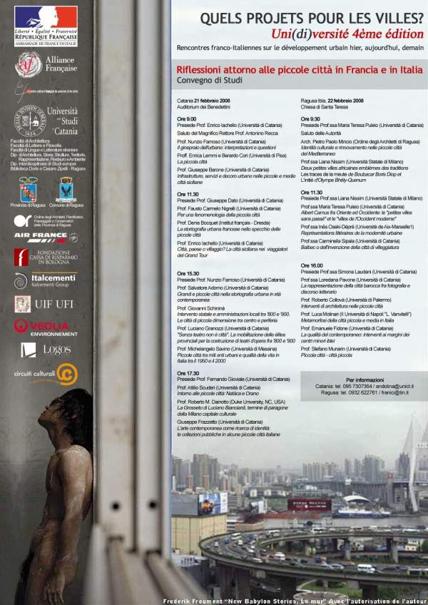 Giovedì 21 febbraio all' Auditorium dei Benedettini, Catania e venerdì 22 febbraio alla Chiesa di Santa Chiara, Ragusa Ibla, si terrà un convegno di studi italo-francese dal titolo: Quels projets pour les villes? Uni(di)versité 4ème édition. Il convegno verterà sul tema: Riflessioni attorno alle piccole città in Francia e in Italia. Il convegno è organizzato dalle facoltà di Architettura, Lettere e filosofia, Lingue e Letterature straniere, il Dipartimento di Architettura, Storia, Strutture, Territorio, Rappresentazione, Restauro e Ambiente, il Dipartimento interdisciplinare di Studi europei, la Biblioteca "Doris e Cesare Zipelli" - Ragusa, i Circuiti Culturali, in collaborazione con l' Alliance Française, l' Ambasciata di Francia in Italia, l' Ordine degli Architetti Pianificatori Paesaggisti e Conservatori della provincia di Ragusa.