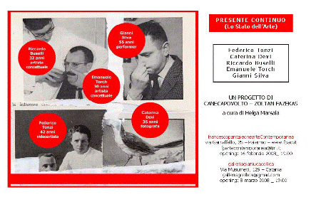 Sabato 8 marzo alle 19 alla Galleria Gianluca Collica, via Musumeci 129, si inaugura la mostra del gruppo d'arte catanese Canecapovolto, dal titolo: Presente continuo (Lo stato dell'arte). La mostra sarà visitabile fino a metà aprile.