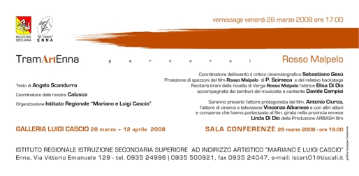 Venerdì 28 marzo alle 17 alla galleria Luigi Cascio (Istituto Regionale Istruzione Secondaria ad Indirizzo Artistico "Mariano e Luigi Cascio", via Vittorio Emanuele 129, Enna) si terrà il vernissage coordinato da Calusca dal titolo: TRamArteEnna percorsi. La mostra sarà visitabile fino al 12 aprile 2008.