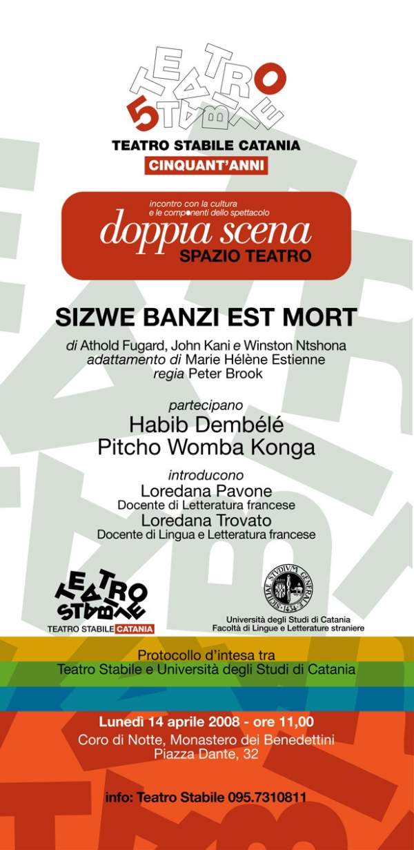 Dopo aver portato per la prima volta a Catania il teatro di Peter Brook con lo spettacolo The Grand Inquisitor, programmato lo scorso gennaio, propone ora la messinscena di Sizwe Banzi est mort. Si tratta di un altro autentico evento, che consentirà al pubblico etneo un più consapevole e diretto approccio con quel teatro “primario” - in grado cioè di abbattere le differenze linguistiche e culturali - che costituisce la linea direttrice di uno dei maggiori registi viventi.