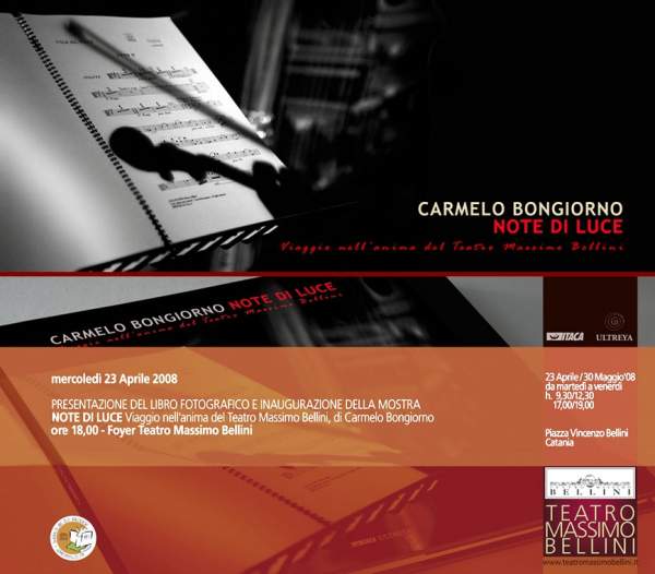 Note di luce è il nuovo lavoro fotografico di Carmelo Bongiorno, artista catanese noto in Italia e in Europa con 25 anni di mostre, pubblicazioni e riconoscimenti; il lavoro è composto da 77 immagini inedite in bianco nero e a colori realizzate nell’arco di un anno. Il volume e l’omonima mostra verranno presentati il 23 aprile, Giornata Mondiale Unesco del Libro (sin dal 1995) alla presenza di personalità del mondo dell’arte e della cultura. La mostra resterà aperta al pubblico fino al 30 Maggio 2008.