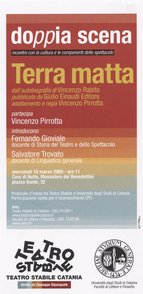 Sabato 14 marzo alle 21 da Scenario Pubblico proseguirà la rassegna teatrale Gesti, curata da Guglielmo Ferro, con la rappresentazione di Terra matta, novità assoluta dall'autobiografia di Vincenzo Rabito. Lo spettacolo, in scena fino al 5 aprile, è una produzione del Teatro Stabile di Catania, in collaborazione con TeSt. La regia è di Vincenzo Pirrotta. Gli interpreti sono: Vincenzo Pirrotta, Amalia Contarini , Marcello Montalto, Alessandro Romano.