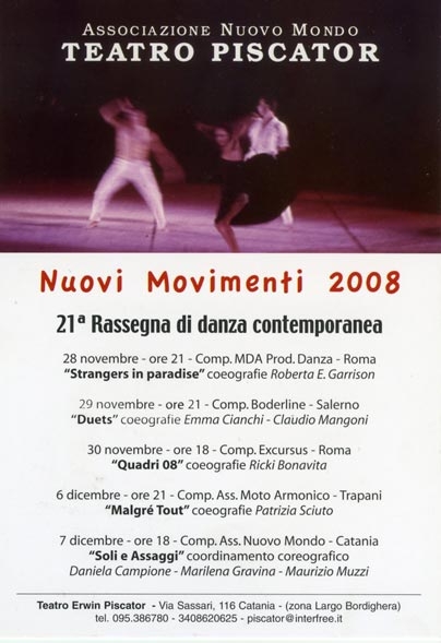 Da venerdì 28 novembre a domenica 7 dicembre al Teatro Erwin Piscator ( via Sassari 116) si svolgerà Nuovi Movimenti il 21° Festival di Danza Contemporanea 2008.