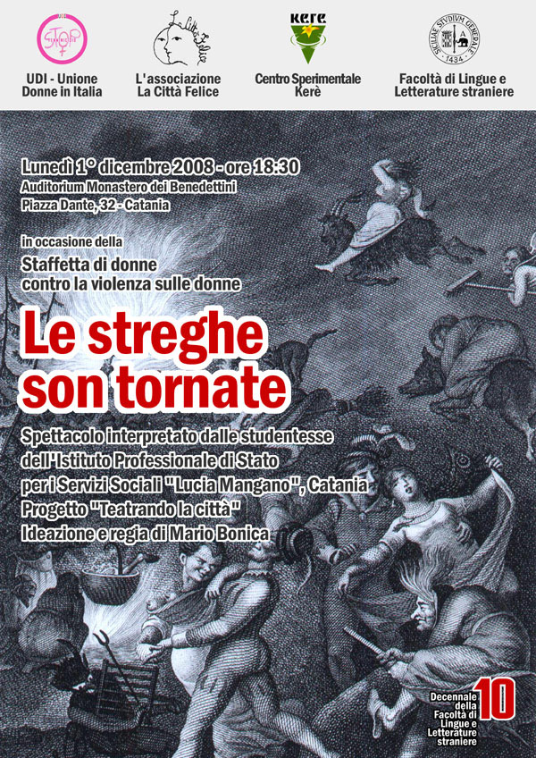 In occasione della Staffetta di donne contro la violenza sulle donne organizzata dall’Udi (Unione Donne in Italia) al grido di Stop al femminicidio - partita martedì 25 novembre da Niscemi per attraversare per 365 giorni tutta l’Italia - la sezione Udi catanese, l’associazione La Città Felice, il Centro Sperimentale Kerè e la facoltà di Lingue e Letterature straniere presentano uno spettacolo dal forte valore civile, Le streghe son tornate, interpretato dalle studentesse dell’Istituto professionale di Stato per i Servizi Sociali “Lucia Mangano” di Catania che hanno partecipato al Progetto “Teatrando la città” nell'anno scolastico 2007-08.