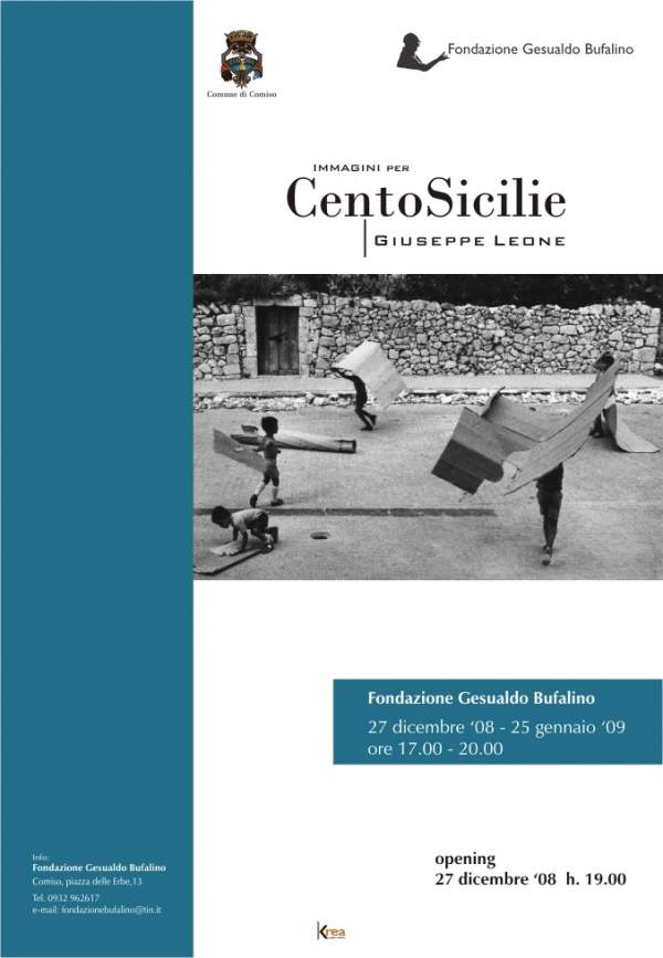 Sabato 27 dicembre alle 19 a Comiso, nella suggestiva sede della Fondazione Gesualdo Bufalino (piazza delle Erbe, 13)sarà inaugurata la mostra fotografica di Giuseppe Leone dal titolo Immagini per Cento Sicilie. Le fotografie sono quelle che corredavano le prime edizioni del volume di Gesualdo Bufalino e Nunzio Zago, Cento Sicilie, testimonianze per un ritratto (Firenze, La Nuova Italia, 1993). Ristampato agli inizi del 2008 dalla casa editrice Bompiani, il volume risulta privo delle fotografie di Giuseppe Leone. La Fondazione Gesualdo Bufalino le ripropone, grazie alla disponibilità dell’autore, con una mostra che rimarrà aperta dal 27 dicembre al 27 gennaio 2009.