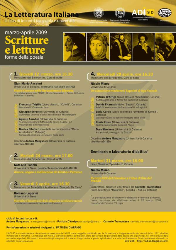 Scritture e letture: forme della poesia, curato dalla Sezione Didattica di Catania dell’Adi (Adi-Sd), in collaborazione con Università di Catania, facoltà di Lettere e Filosofia, dipartimento di Filologia moderna.
