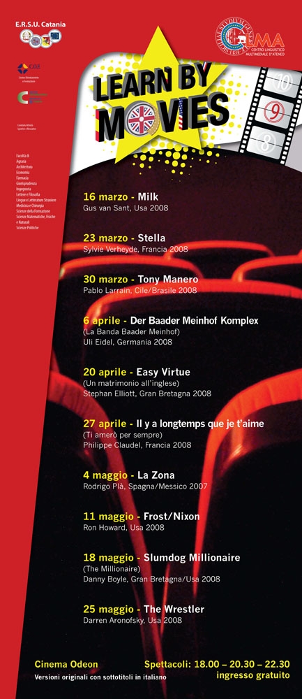 Lunedì 16 marzo riparte al Cinema Odeon la nona edizione del Learn by movies, la rassegna cinematografica in lingua originale dell’Università di Catania. Organizzata dal Centro linguistico multimediale d’Ateneo (Clma), in collaborazione con Ersu, Cof, Cus, Casr e con il contributo di tutte le facoltà dell’ateneo e la partnership dei media universitari, la rassegna ha in programma anche per quest’anno una selezione delle migliori pellicole della recente stagione cinematografica, in versione originale con sottotitoli in italiano, tra cui spicca Milk, la pellicola di Gus Van Sant che si è aggiudicata il premio Oscar per l’interpretazione maschile di Sean Penn. Il film che lunedì 16 marzo inaugura il cineforum a ingresso gratuito è Slumdog Millionaire (The Millionaire) diretto da Danny Boyle e vincitore di ben otto premi Oscar, tra cui miglior film e miglior regia.