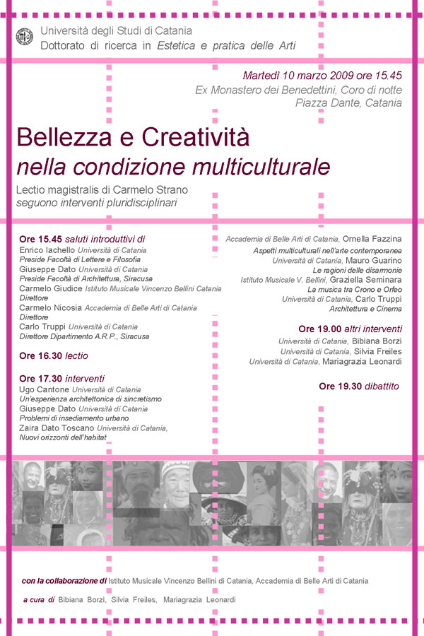 L’incontro – che rientra nell’ambito delle attività del dottorato di ricerca in Estetica e pratica delle arti – si aprirà con gli indirizzi di saluto del preside di Lettere, Enrico Iachello, del preside di Architettura Giuseppe Dato, del direttore dell’Istituto musicale Vincenzo Bellini Carmelo Giudice, del direttore dell’Accademia di Belle arti di Catania Carmelo Nicosia e del direttore del dipartimento Arp di Siracusa, Carlo Truppi. Dopo la lectio, seguiranno alcuni interventi pluridisciplinari a cura dei professori Ugo Cantone, Giuseppe Dato, Zaira Dato Toscano, Ornella Fazzina, Graziella Seminara, Carlo Truppi e delle giovani ricercatrici Bibiana Borzì, Silvia Freiles e Mariagrazia Leonardi.