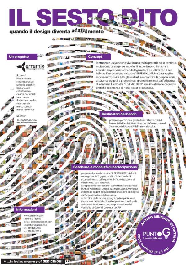 L’associazione culturale Erremix officina paesaggi in movimento organizza, in occasione del G8 Ambiente 2009, che si svolgerà a Siracusa dal 22 al 24 aprile, la mostra Il sesto dito: quando il design diventa adattamento che sarà allestita all’Antico Mercato di Ortigia che, dal 17 al 26 aprile, ospiterà l’evento “Punto G_il mercato delle idee”.