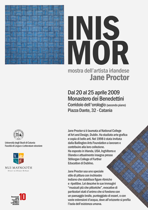 Sarà visitabile a partire da lunedì 20 aprile, nel Corridoio dell'Orologio del Monastero dei Benedettini (II piano), la mostra dell’artista irlandese Jane Proctor dal titolo Inis Mor, la più grande delle Isole Aran, al largo della costa occidentale irlandese.