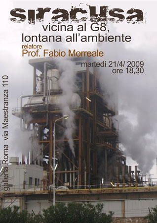 Martedì 21 aprile alle 18:30 alla Galleria Roma (via Maestranza, 110 - Siracusa) si terrà incontro culturale dal titolo Siracusa. Vicina al G8, lontana all'ambiente a cura di Fabio Morreale, presidente Natura Sicula onlus. L'evento sarà presentato da Salvatore Zito. L'organizzazione e la direzione sono a cura di Corrado Brancato. L'ingresso è libero.