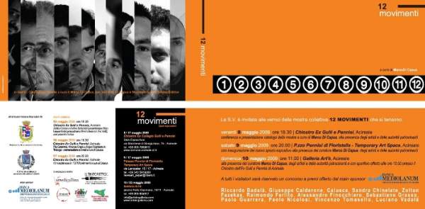 12 Movimenti, ossia 12 sentimenti, esperienze, dinamiche esistenziali in cerca di altrettante individuali espressioni, proprie manifestazioni in un contesto storico - intellettuale comune. La scoperta del sentire ancora viva la necessità di vivere il proprio tempo ed il proprio spazio offrendogli, nuovamente, la possibilità di un riscatto artistico – culturale: 12 artisti per un comune, Acireale. Non è una formazione precostituita (un gruppo), non è un scuola; 12 movimenti non è altro che l’insieme di altrettante volontà di raccontare se stessi attraverso le pagine di un racconto comune, manifestare il proprio moto tramite un confronto sano, amichevole, quotidiano con altre voci che dalla stessa terra alimentano le proprie radici. Gli artisti in questione sono: Riccardo Badalà, Giuseppe Calderone, Calusca, Sandra Chinelate, Raimondo Ferlito, Zoltan Fazekas, Alessandro Finocchiaro, Sebastiano Grasso, Paolo Guarrera, Paolo Nicolosi, Vincenzo Tomasello, Luciano Vadalà
