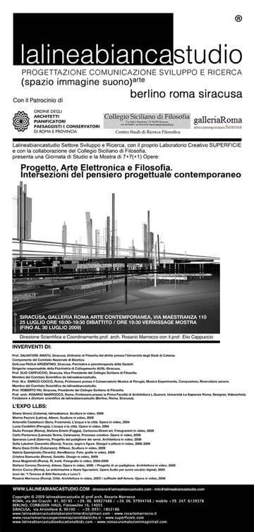 Sabato 25 luglio alle 18 alla Galleria Roma (via Maestranza, 110 - Siracusa) si svolgerà una giornata di studio ed esposizione dal titolo Progetto, Arte Elettronica e Filosofia. Intersezioni del pensiero progettuale contemporaneo, a cura de Lalineabiancastudio. L'ideazione e la direzione scientifica sono del prof. Rosario Marrocco con il prof. Elio Cappuccio.