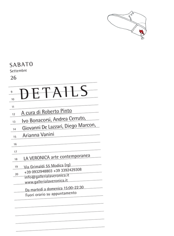 Dopo la pausa estiva, la galleria riapre la stagione espositiva con una collettiva di giovani artisti ribadendo la volontà di far conoscere al pubblico protagonisti emergenti del panorama artistico contemporaneo. In una società che è sempre più mediatica e alla ricerca di grandiosità e provocazioni, l’idea di Details riporta l’attenzione sui particolari dimenticati. Gli artisti che partecipano alla mostra condividono l'intento di lavorare ignorando la spettacolarità a cui ultimamente anche l’arte contemporanea ha ceduto. La collettiva riunisce sei artisti dal percorso e dagli esiti artistici differenti ma uniti da questo comune atteggiamento di ricerca. Il progetto, il disegno e i particolari tornano al centro di un discorso artistico fatto di riscoperte e di dettagli.