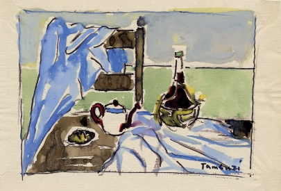 La mostra comprende una serie di ricercate e preziose piccole opere (matite, acquerelli e tempere), un omaggio al maestro di Jesi scomparso nel 1994, una sorta di interessante diario di una vicenda che conobbe pagine felici: dalle ariose vedute romane degli anni trenta ai grattacieli di New York, dalle vedute di Parigi ai ritratti e agli studi per teatro, musica, cinema, editoria. Quando la fugacità di un soggiorno non consente la pittura, ecco la memoria fermata irrepetibilmente nella fluida cromia dell'acquerello. Tamburi viaggia molto, in vari periodi, ritraendo impressioni e immagini dei vari paesi che visita: Spagna, Inghilterra, Olanda, Grecia, Stati Uniti, sono gli itinerari che più colpiscono la sua immaginazione. Non v'è tecnica di linguaggio figurativo che Tamburi non conosca; matite, chine, pastelli, tempere, acquerelli diventano strumento per fermare frammenti di vivida realtà.