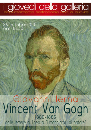 Il Prof. Giovanni Ierna che svilupperà alcuni temi circa la formazione artistica di Vincent Van Gogh, relativi al periodo 1880 - 1885 vissuto dall’artista con intensità di ricerca e volontà di risultati negli ambienti degli umili e dei diseredati contadini, minatori, operai. Attraverso alcuni testi critici e autografi si vorrà porre in evidenza l’esito della prima fase pittorica dell’autore.