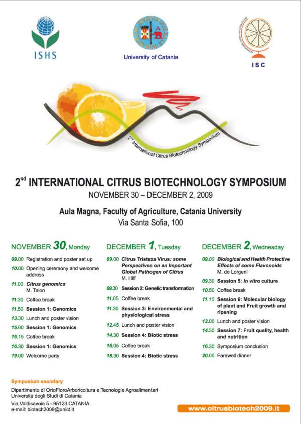 Second International Citrus Biotechnology Symposium. Il simposio, patrocinato dal gruppo di lavoro "Citrus" dell’Ishs (International Society for Horticultural Science) e dell’Isc (International Society of Citriculture), rappresenta un evento molto atteso da parte della comunità scientifica internazionale.