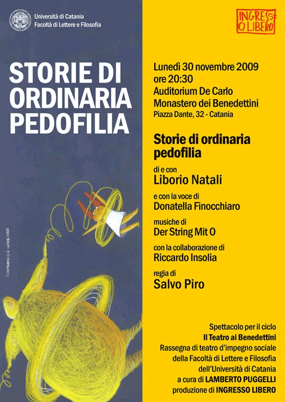 Storie di ordinaria pedofilia che inaugura il ciclo “Il Teatro ai Benedettini”, rassegna di teatro d’impegno sociale della facoltà di Lettere e Filosofia, a cura di Lamberto Puggelli.