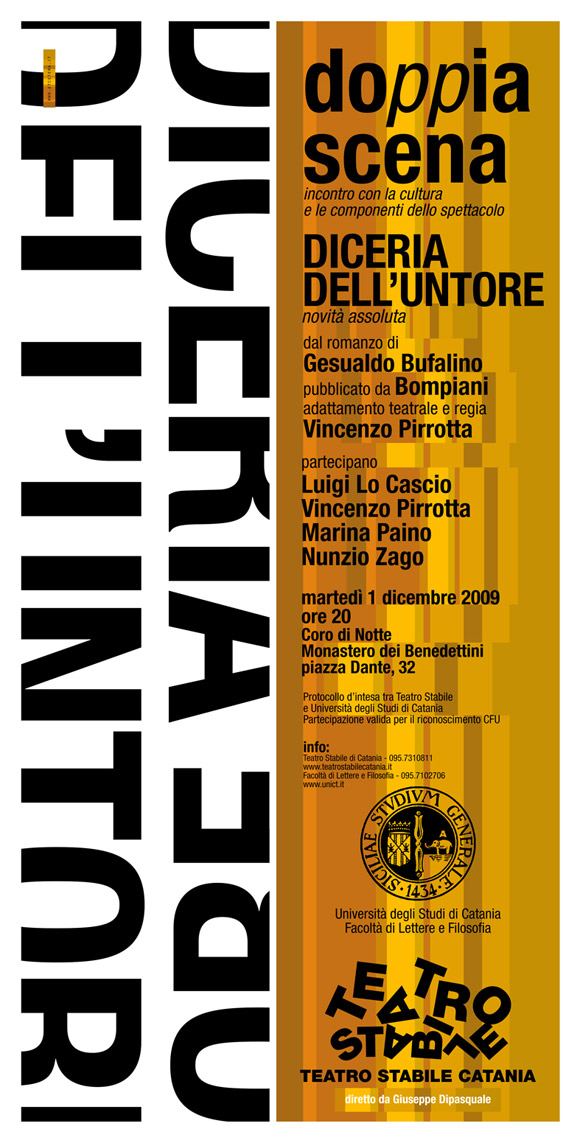 L'appuntamento di martedì 1 dicembre sarà dedicato allo spettacolo inaugurale della stagione, Diceria dell'untore, tratto dal romanzo di Gesualdo Bufalino, storia di amore a morte ambientata nel dopoguerra in un sanatorio sulle alture di Palermo, tra malati di tbc che affrontano insieme il funesto calvario del morbo. Ad introdurre la conversazione saranno il preside di Lettere Enrico Iachello, il direttore dello Stabile Giuseppe Dipasquale e il docente Ezio Donato, che cura i rapporti tra lo Stabile e l'Università, oltre che dirigere la Scuola d'arte drammatica dello Stabile, intitolata ad Umberto Spadaro.