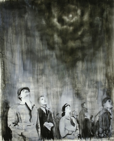 in una composizione quasi astratta. La serie di disegni, Lessons from the Twilight Kingdom, vedono protagonista un gruppo di persone ritratte in un atteggiamento di concentrazione e di ascolto, quasi di riverenza, di fronte ad una massa scura e informe, una sorte di “nube nera” che dissimula la presenza di un’entità misteriosa. Insieme a quei personaggi che la seguono/ fissano/ interpellano, diventa per l’artista un’immagine del potere sconosciuto - politico o religioso -