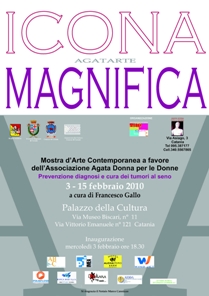 Agatarte Icona Magnifica, una mostra d'arte contemporanea a scopo benefico a favore dell'associazione Agata donna per le donne Onlus con il patrocinio della Presidenza della Regione Siciliana, Assessorato ai beni culturali del Comune di Catania, Assessorato ai beni culturali della Provincia Regionale di Catania, Accademia di Belle Arti di Catania.