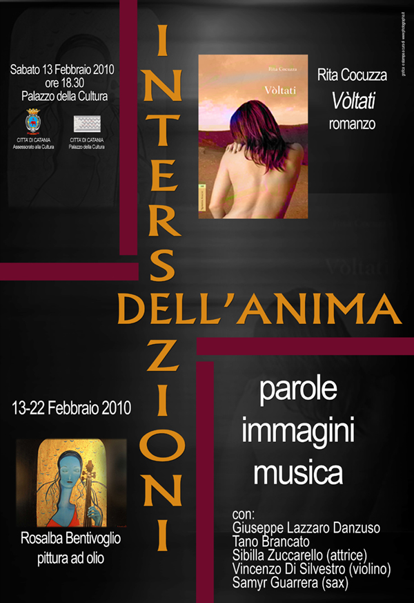 Intersezioni dell’anima, rappresenta un viaggio nell’universo femminile tra “parole immagini e musica”. La manifestazione, condotta dal giornalista-scrittore Giuseppe Lazzaro Danzuso con la partecipazione del maestro Tano Brancato, vedrà la presentazione del romanzo Vòltati(Aracne, Roma) della giornalista Rita Cocuzza e dei quadri a olio della cantante-musicista Rosalba Bentivoglio.