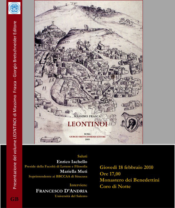 Giovedì 18 febbraio alle 17, nel Coro di Notte del Monastero dei Benedettini, il prof. Francesco D'Andria, dell'Università del Salento, presenta il volume Leontinoi del prof. Massimo Frasca, edito da Giorgio Bretschneider.