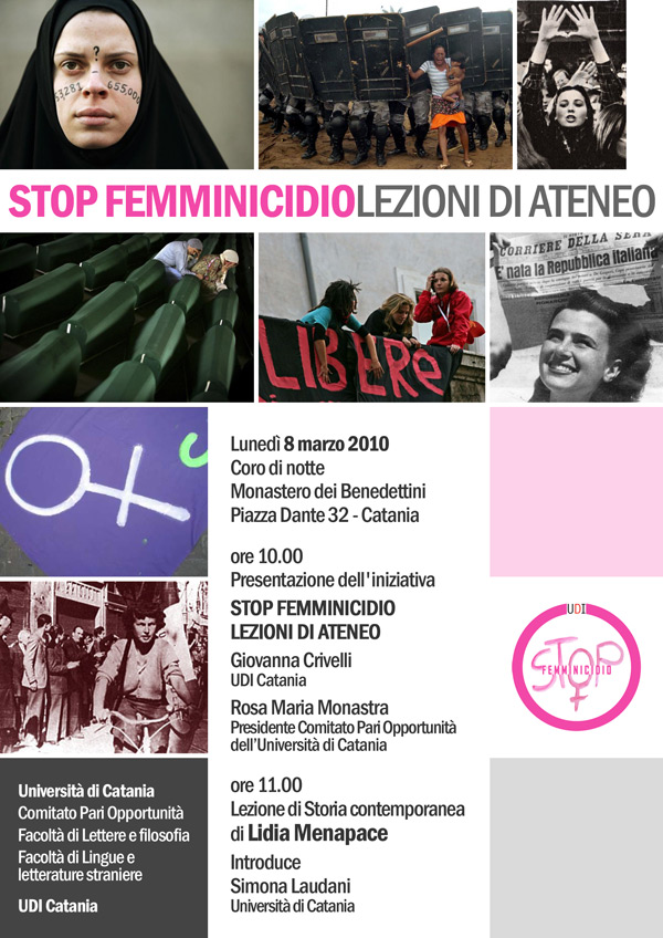 - Stop Femminicidio - Lezioni di Ateneo: Lunedì 8 marzo alle 10, nel Coro di notte dei Benedettini, presentazione dell'iniziativa promossa dall'Udi e dal Cpo. A seguire, lezione di storia contemporanea tenuta da Lidia Menapace (08 marzo 2010)