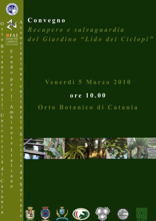 Venerdì 5 marzo alle 10, l'aula centrale dell’Orto Botanico di Catania ospita l’incontro Recupero e salvaguardia del giardino “Lido dei Ciclopi”. Il convegno è organizzato dall’Orto Botanico di Catania in collaborazione con il Fai, Fondo Ambiente Italiano, di Catania e con l’associazione culturale “Sicilia da Salvare”.