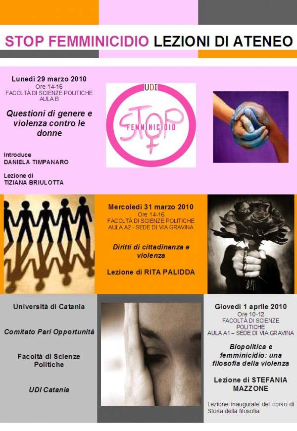 Stop femminicidio. Lezioni di Ateneo, promossa dal Comitato pari opportunità dell’Università e dall’Udi (Unione donne in Italia) di Catania.