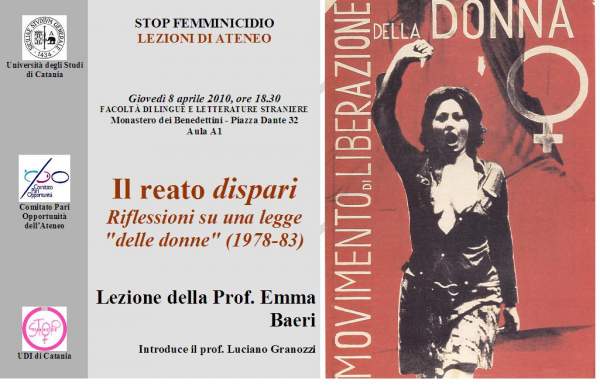 - Il reato "dispari". Riflessioni su una legge "delle donne" (1978-83): Giovedì 8 aprile alle 18:30, nell’aula A1 del Monastero dei Benedettini, lezione tenuta da Emma Baeri per il ciclo “Stop Femminicidio. Lezioni di Ateneo” (08 aprile 2010)