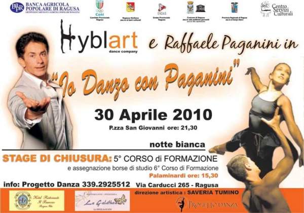 La A.C.S.D. Progetto Danza, Scuola di danza classica e moderna di Ragusa e centro di eccellenza del settore, nell’ambito del 5°corso di formazione, visto l’enorme riscontro ottenuto con la manifestazione “Danzando Paganini” svoltasi il 18 e 19 novembre 2009 durante la quale il M° Raffaele Paganini ha tenuto uno stage formativo di danza classica, vuole estendere a 100 possibili partecipanti la possibilità di effettuare una lezione con il Maestro attraverso il progetto “Io Danzo con Paganini”.