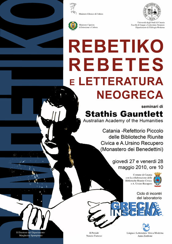 Giovedì 27 e venerdì 28 maggio, al Refettorio piccolo (Biblioteche riunite Civica e Ursino-Recupero, Monastero dei Benedettini), alle 10, si svolgeranno i seminari "Rebetiko, rebetes e letteratura neogreca" tenuti da Stathis Gauntlett dell'Australian Academy of the Humanities.