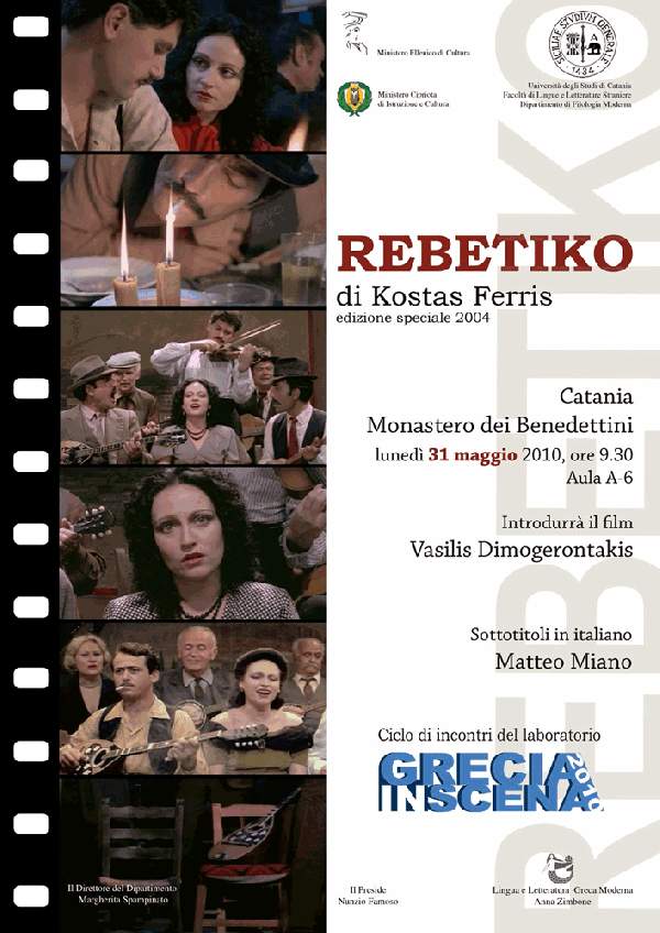 Infine, lunedì 31 maggio alle 9:30, nell'aula A6 del Monastero dei Benedettini, sarà proiettato il film Rebetiko di Kostas Ferris, con sottotitolo in italiano a cura di Matteo Miano. A introdurre la proiezione sarà Vasilis Dimogerontakis.