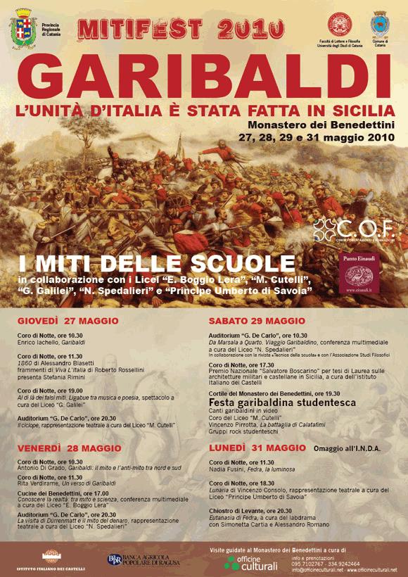 Il programma del Mitifest, incentrato quest'anno sul tema Garibaldi, L’unità d’Italia è stata fatta in Sicilia, e organizzato in collaborazione con i licei “Boggio Lera”, “Cutelli”, “Galilei”, “Spedalieri” e “Principe Umberto di Savoia”, presenta diverse iniziative: conferenze, spettacoli teatrali e mostre sul tema garibaldino negli splendidi locali del Monastero. Il programma dettagliato è disponibile sul sito della Facoltà di Lettere e Filosofia, www.flett.unict.it.