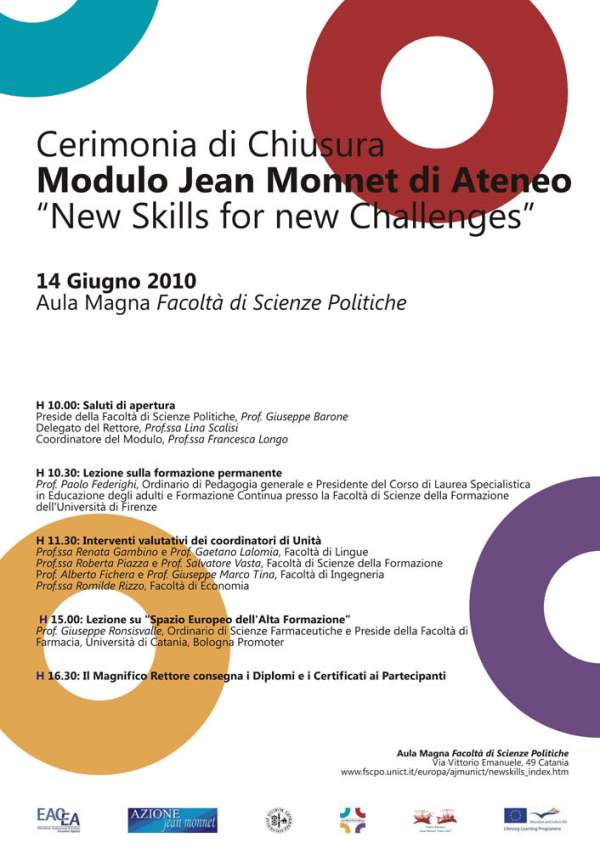 Lunedì 14 giugno alle 10, nell'aula magna della facoltà di Scienze Politiche, si svolge la cerimonia di chiusura del Modulo Jean Monnet di Ateneo New Skills for new Challenges.