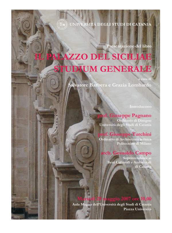 Martedì 29 maggio alle 10 nell'aula magna del Palazzo Centrale dell'Università (piazza Università 2) sarà presentato il libro Il Palazzo del Siciliae Studium Generale, curato dai docenti Salvatore Barbera e Grazia Lombardo.